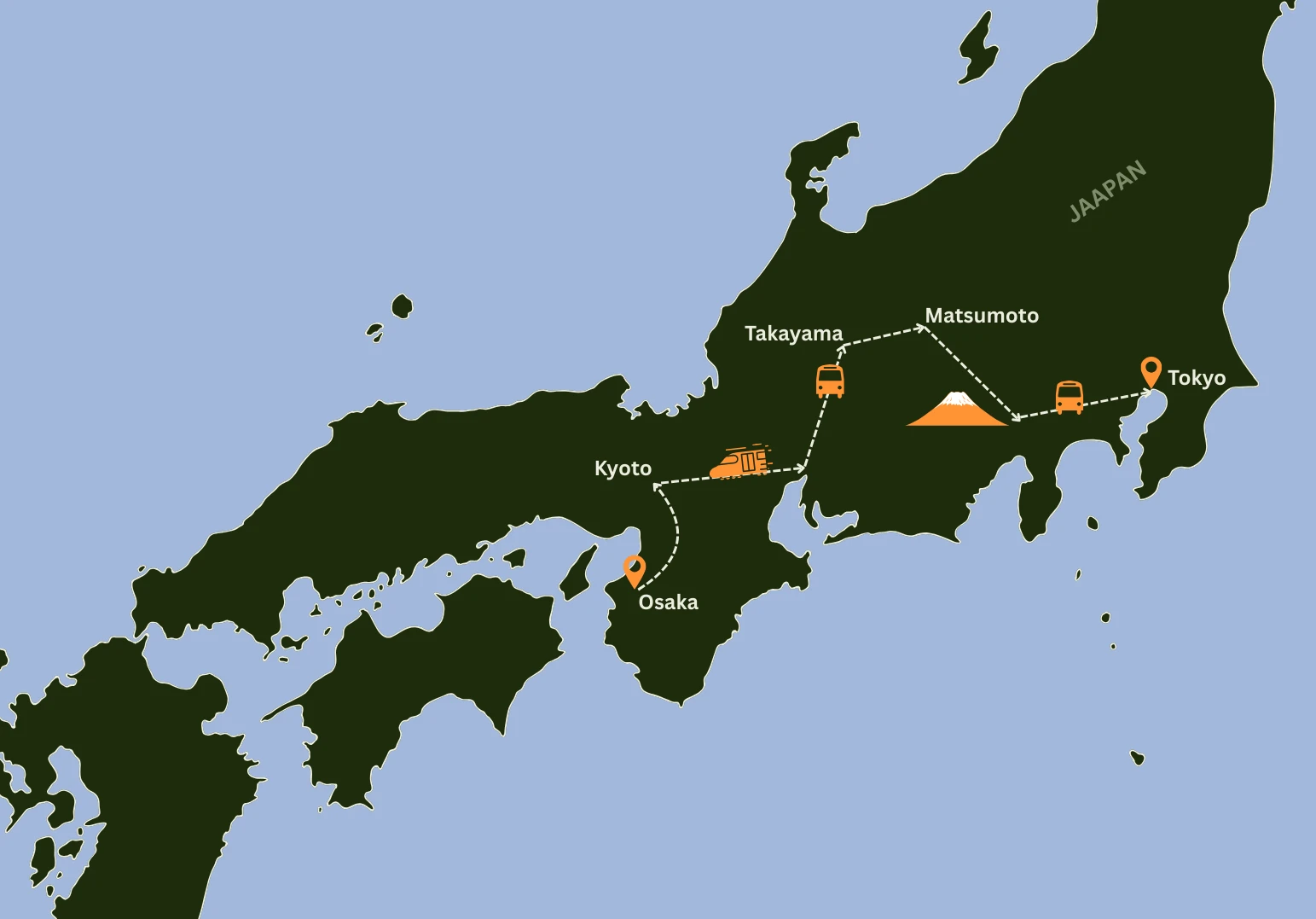 Alustuseks tutvume iidse pealinna Kyoto pärlitega. Seejärel sõidame sügavale sisemaale. Rändame läbi 17.sajandi külade ja linnakeste, peatudes traditsioonilistes külalistemajades ja avastades Jaapani põliskultuuri. Seejärel suundume püha Fuji mäe poole. Fuji juurest sõidame moodsasse Tokyosse. Kokku moodustub Kuldne Kolmnurk.