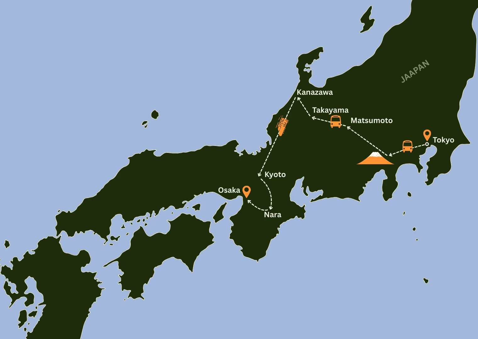 Alustame pealinna Tokyo paari päeva pikkuse avastamisega ning seejärel suundume püha Fuji mäe poole. Hakkame sõitma ookeani rannikult põhja suunas, teisele poole mere äärde Kanazawasse, peatudes vahepeal traditsioonilistes külalistemajades ja avastades Jaapani põliskultuuri. Läänerannikult sõidame tagasi lõuna poole Kyotosse, kus peatume pikemalt, ning reis lõppeb Osakas. Sinna sõites külastame ka iidset Nara linna. Kokku moodustub Kuldne Kolmnurk.