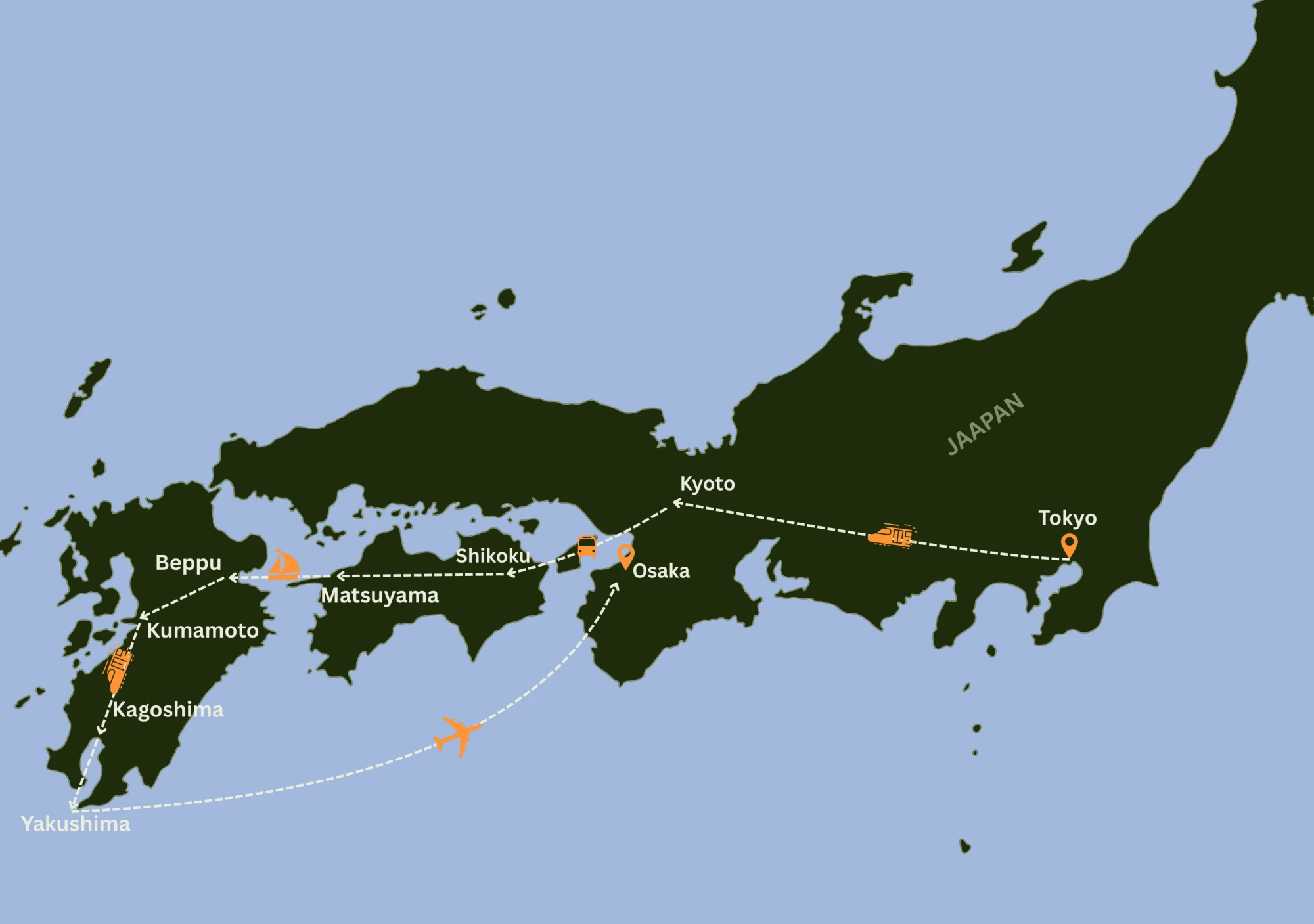 Alustame põgusa peatusega Jaapani moodsas pealinnas Tokyos ja iidses pealinnas Kyotos. Seejärel sõidame peasaarelt väiksemale Shikoku saarele, kus matkame iidsel palverännaku teel ja veedame öö ehtsas templis. Shikokult sõidame Kyuushu saarele ning sealt edasi Unesco maailmapärandi paika Yakushima saarele. Yakushimalt lendame Osakasse.