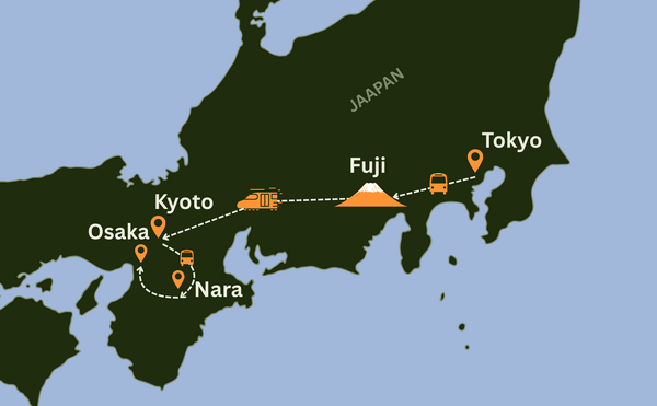 Algab kireva Tokyo avastamisega – suurlinn, mis ühendab kaasaegse elu ja traditsioonid ainulaadsel moel. Seejärel liigume Fuji mäe piirkonda, kus naudime ööd traditsioonilises ryokanis koos onseni ehk kuumaveeallikaga. Edasi sõidame kiirrongiga Kyotosse, maailma tunnustatuimasse kultuurilinna, kus külastame templeid, bambusmetsa ja geishade kvartaleid. Käime ka lähedal asuvas Naras, mis on tuntud oma sõbralike hirvede ja hiiglasliku Buddha poolest. Reis lõpeb Osakas, Jaapani lõbusas ja maitseküllases kulinaariapealinnas.