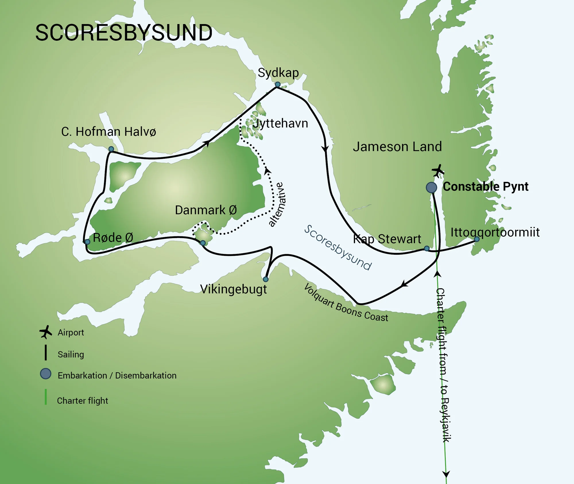 Maailma suurim saar Gröönimaa on kaetud määratu jääkilbiga. Enamjagu saarest asub polaarjoonest põhja pool. Äärmiselt hõreda asustuse tõttu pääseb Gröönimaal ühest paigast teise põhiliselt vaid meritsi. Ekspeditsioon viib meid 12 päevaks Ida-Gröönimaa rannikule, Scoresby Sundi, mida peetakse Gröönimaa ning ühtlasi kogu maailma suurimaks fjordide võrgustikuks. Gröönimaa idaosas Grööni meres asuv fjordide maa on justkui puu, mis on oma oksad laiali sirutanud ligi 38 000 km2 suurusel alal. Võrgustiku pikim fjord sirutub 350 kilomeetrit rannikust sisemaa poole. Merel näeme põhjapoolkera vägevaimaid jäämägesid. Maismaaretkedel mägitundrates ehk tundrutes kohtame uhkeid linnukolooniaid, kes valmistuvad talveks lõuna poole lendama. Eredamaid loomaelamusi pakuvad muskusveised.