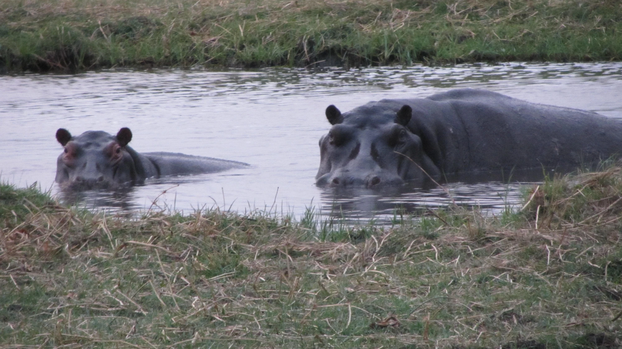 Pärast paaritunnist vahetpidamata sõitu vähendab paat viimaks hoogu. Roostikus avaneb väikese järve suurune vaba veega ala. Veepinnal pole näha kedagi. Paadimees teatab tasasel häälel, et siin asub jõehobude lemmikpaik. Vesi on sügavam kui ümbruskonnas ja jõehobud saavad vajadusel vee all ringi ujuda ning end peita. Paadimees on kindel, et lähema viie minuti jooksul saame mõnda jõehobu näha. Kauem üks loom ühtejärge vee all ei ole. Nii juhtubki. Äkitselt kerkib vett kahele poole pritsides ning häälekalt puristades meist ligi saja meetri kaugusel nähtavale jõehobu uskumatult suur pea. Kohe ilmub ta kõrvale kaaslane. Loomad pööravad oma pisikesed silmad meie poole ja jäävad uudistama. Minu küsimuse peale, kas võiks pildistamiseks lähemale liikuda, raputab paadimees otsustavalt pead. "Kui jõehobu leiab, et on tuldud liiga lähedale, sukeldub ta vee alla, ujub märkamatult paadi juurde ja tõukab selle ümber," seletab ta. Emas- ja isasloom piidlevad meid vaikides ja just nagu rahumeelselt. Siis ajab isane jõehobu ootamatult laiali oma päratud lõuad. Need on nii suured, et meie paat mahuks sinna vahele risti vabalt ära. Näib, nagu tahaks jõehobu meile korraks demonstreerida oma suuõõnsuse kõiki üksikasju. Sealt paistavad pika sekundi jooksul lai punakas suulagi ja kollased hambad, mille pikkus vähemalt paarkümmend sentimeetrit. "Hambapartii on viletsavõitu," on mu esimene isiklik tähelepanek jõehobu suuõõnsuse kohta. Hambad asetsevad tõesti ebakorrapäraselt, hõredalt ja kuidagi puseriti. "See tuleb muidugi sellest, et jõehobu on taimesööja. Söömiseks pole tal korralikke kihvu tarvis. Suured hambad ammuli suus on isasloomal vaid selleks, et kohutada teist isast," meenutan endamisi raamatust loetud tarkust. Niisiis annab jõehobu suud maigutades selgesti märku, et peab meid rivaalideks. Kui soovime astuda temaga võitlusse, peame kõigepealt avama suu ning näitama oma lõugade mõõtmeid ja hammaste pikkust. Teatud põhjustel loobume sellest.Jõehobud on osa Okavango rikkast ja keerukast elukooslusest