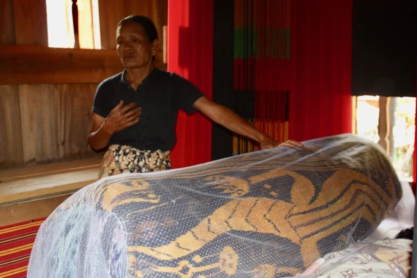 Ta juhatas meid otseteed ühe tongkonani juurde. Rahvas sumises selle all lustlikult nagu mesilaspere. Lapsed jooksid ja kilkasid, naised jõid mõnusasti kudrutades kohvi. Yusuf utsitas meid mööda kitsast õõtsuvat redelit majja ronima. Tongkonani ukseavast sisse saamiseks tuli üheaegselt kõvasti kummarduda ja samas põlved lõua alla tõmmata. Lävepakk oli kõrge, samas ukseava hästi madal. Pressisime ennast avast läbi ja koperdasime mänguasjade ning madratsite otsa. Tongkonanis oli kolm n-ö tuba. Perenaine viipas meid üle mängivate laste lõunapoolsemasse ruumi.Ta toetas ennast mõnusasti nööriga kokkuseotud vatitekihunnikust kookonile, patsutas sellele pehmelt ja ütles: „Mamma, vaata, sulle tulid külalised. Nad teevad nüüd pilti.“ Seejärel sirutas perenaine meie poole tikitud kotikese. Kogu maailmas üheselt mõistetav žest andis märku, kuidas saab kõige paremini lahkunule viimast austust avaldada. Igaüks pistis kotikesse kokkuvolditult 30 000 ruupia (paari euro) suuruse ohvrianni.